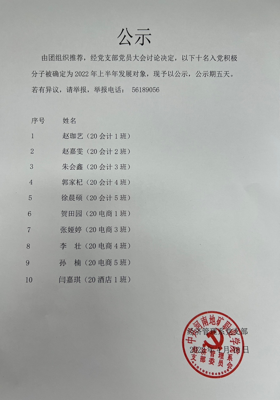 经团组织推荐,支委会研究,全体党员大会通过,决定以下教师和同学被确定为入党积极分子。现予公示,公示期5天。若有异议,请与经济管理系党支部联系。举报电话:0371-56189056 13643825766 经济管理系党支部 ...