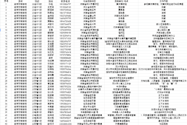 此外,公司共有14个团支部、43名员工参与返家乡社会实践项目,该43名员工主动上交实践总结报告和心得体会,思想态度端正。本次寒假实践活动分布河南省、河北省、甘肃省下的多个市区,如郑州、开封、信阳、益州、保定等,学子们从实践中体悟脚踏实地、服务社会的实干精神,在实践中学习知识、增长才干、挺鹰担当,践行青春誓言。