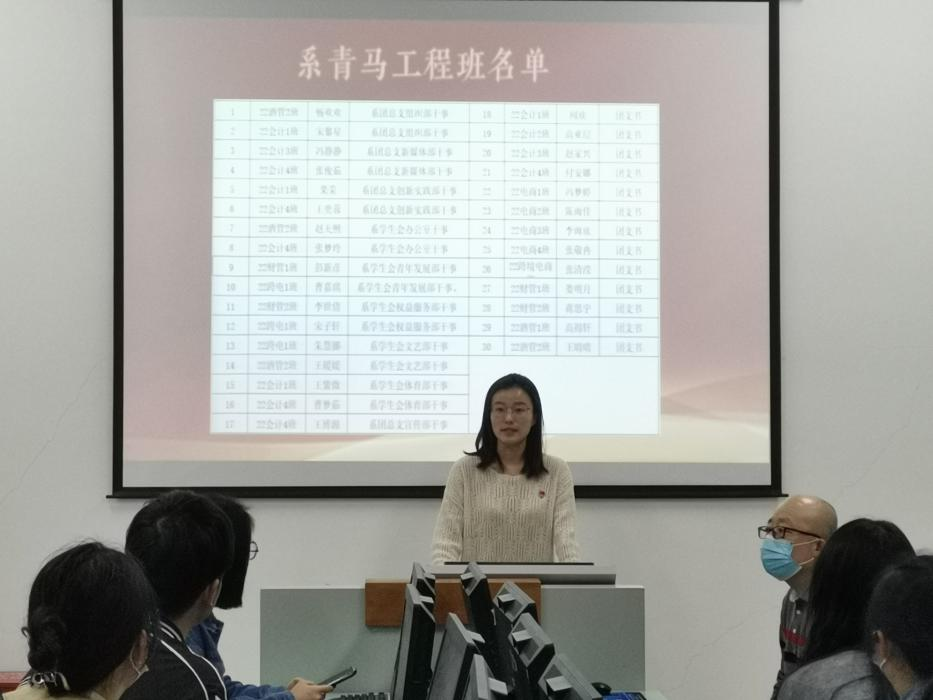 王雨就我系青马工程选拔原则、人员构成、培训计划等内容作了详细介绍。