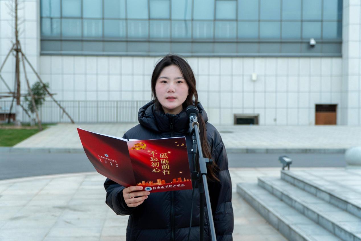 升旗仪式后,25级电子商务3班苗馨予发言,她呼吁同学们一要铭记来路,汲取智慧与力量;二要勇担使命,直面机遇与挑战;三要积极实践,勇于探索与创新。以坚定信念锚定方向,以扎实行动践行誓言,在攻坚克难中创造业绩,在接续奋斗中书写无愧于时代的答卷。