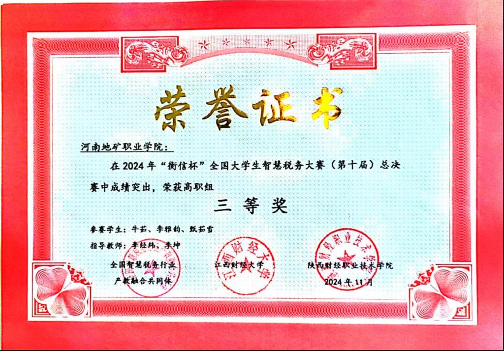 2024年11月22至25日,第十届全国老员工智慧税务大赛总决赛在西财经大学成功举办。此次大赛吸引了全国145 所院校的 501 位学子参赛。公司大数据与财务管理专业的甄如雪、牛茹、李雅韵(指导老师李经纬、李坤)表现优异,荣获全国三等奖。