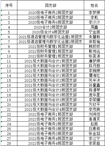 为进一步激励申请入党团员在学习、工作、生活中发挥模范作用,推荐优秀团员作为入党积极分子,我系2020、2021级各团支部于2022年3月召开了支部大会,进行入党积极分子推优工作。根据“公平、公开、公正”的原则,经团支部推优、系团总支审核、并报校团委批准,现将各支部推优工作结果公示如下: