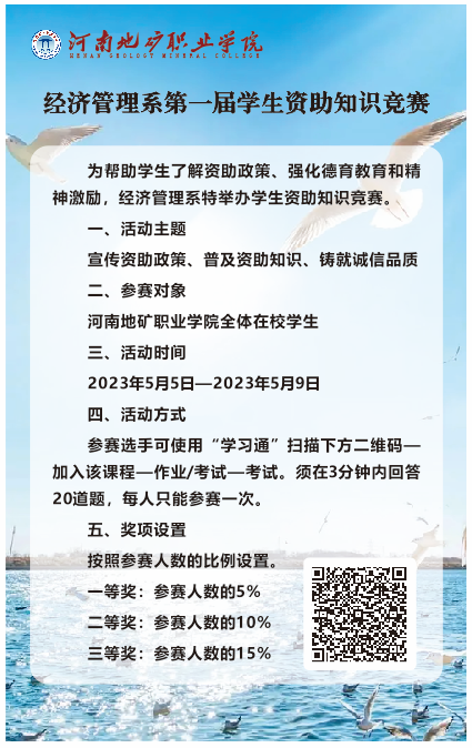 为深入学习贯彻党的二十大精神,全面落实全国教育大会对资助育人工作的要求,大力宣传国家资助政策及成效,强化德育教育和精神激励,经济管理系于5月5日--5月9日开展第一届资助知识竞赛。本次竞赛面向全体在校学...